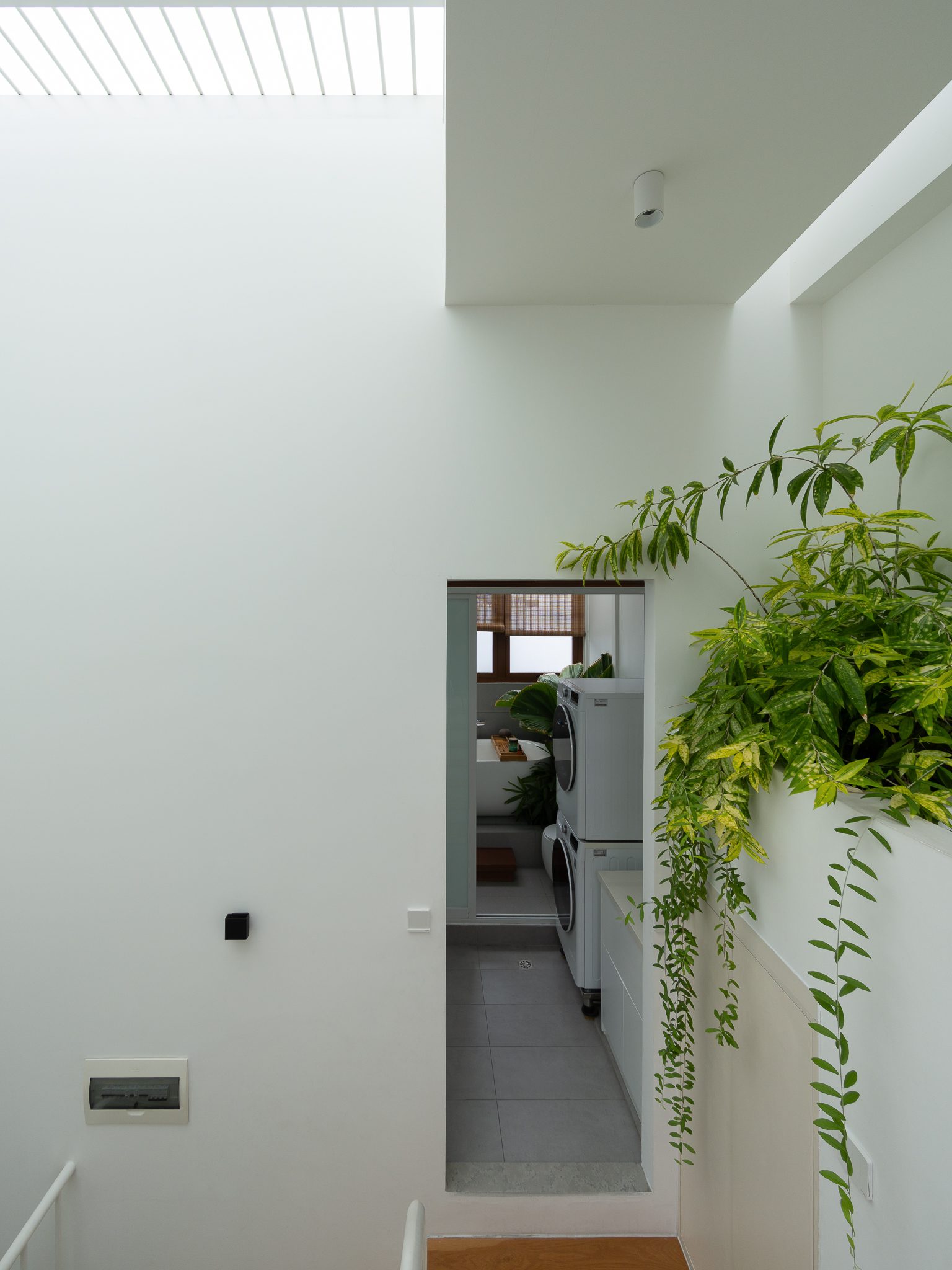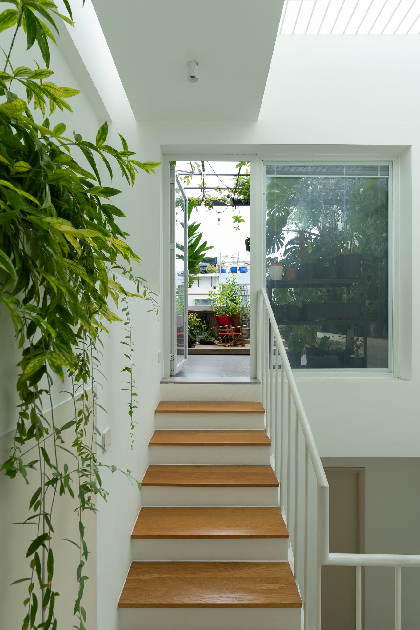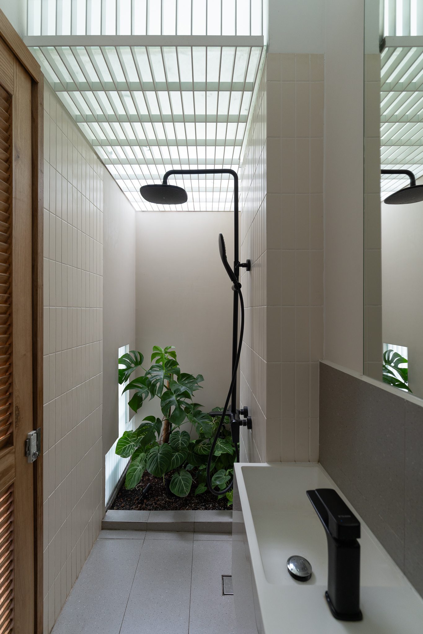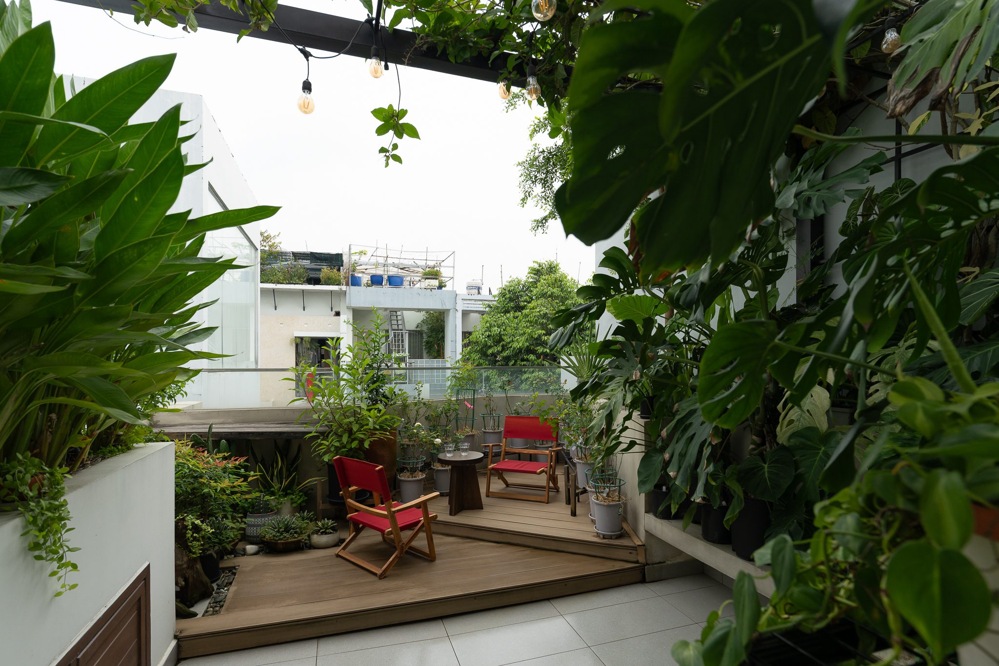 Trên sân thượng, ánh sáng đổ xuống khu tắm bán lộ thiên, kết hợp khu vườn nhỏ – nơi gia chủ trồng và chăm những chậu cây yêu thích. Từ trên cao, ngôi nhà mở ra một cảm giác khác: vừa riêng tư, vừa gần gũi. Sau hai năm kể từ ngày hoàn thiện, A.K Home vẫn giữ nguyên nhịp sống yên ả ấy – một ngôi nhà không phô trương, nhưng phản chiếu rõ ràng cách con người tìm thấy sự bình yên trong những điều giản dị nhất.