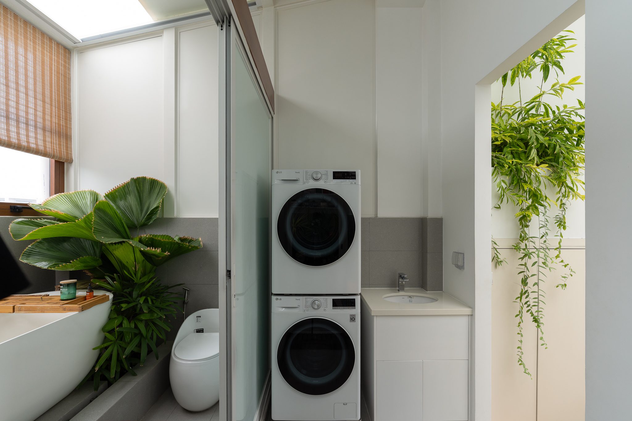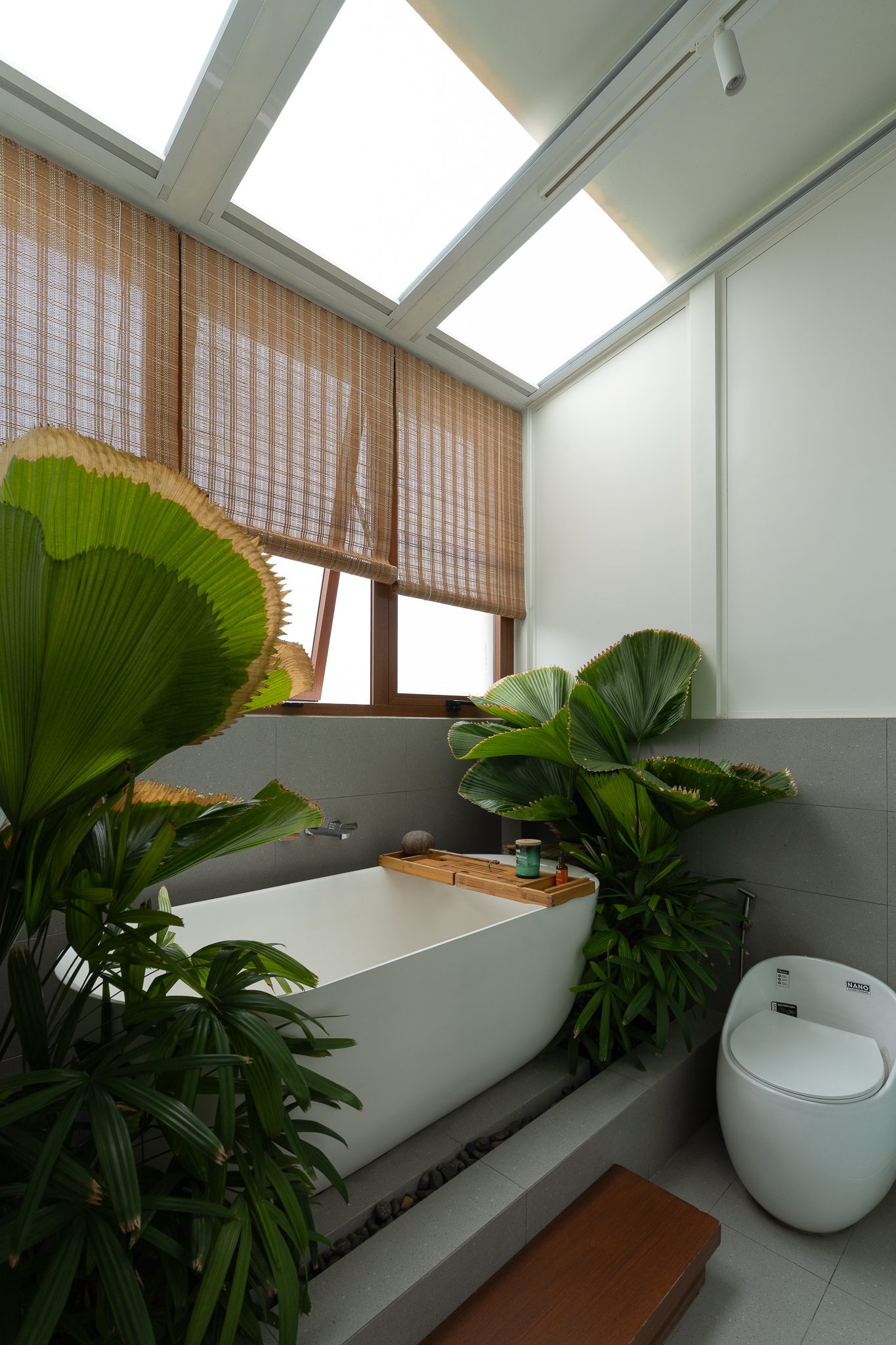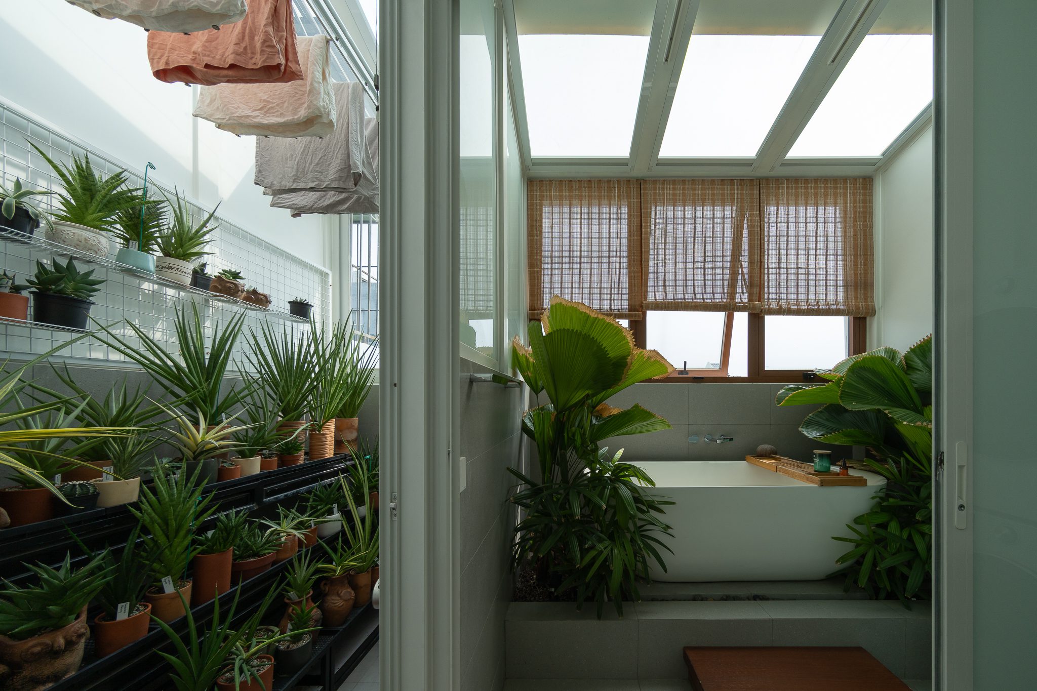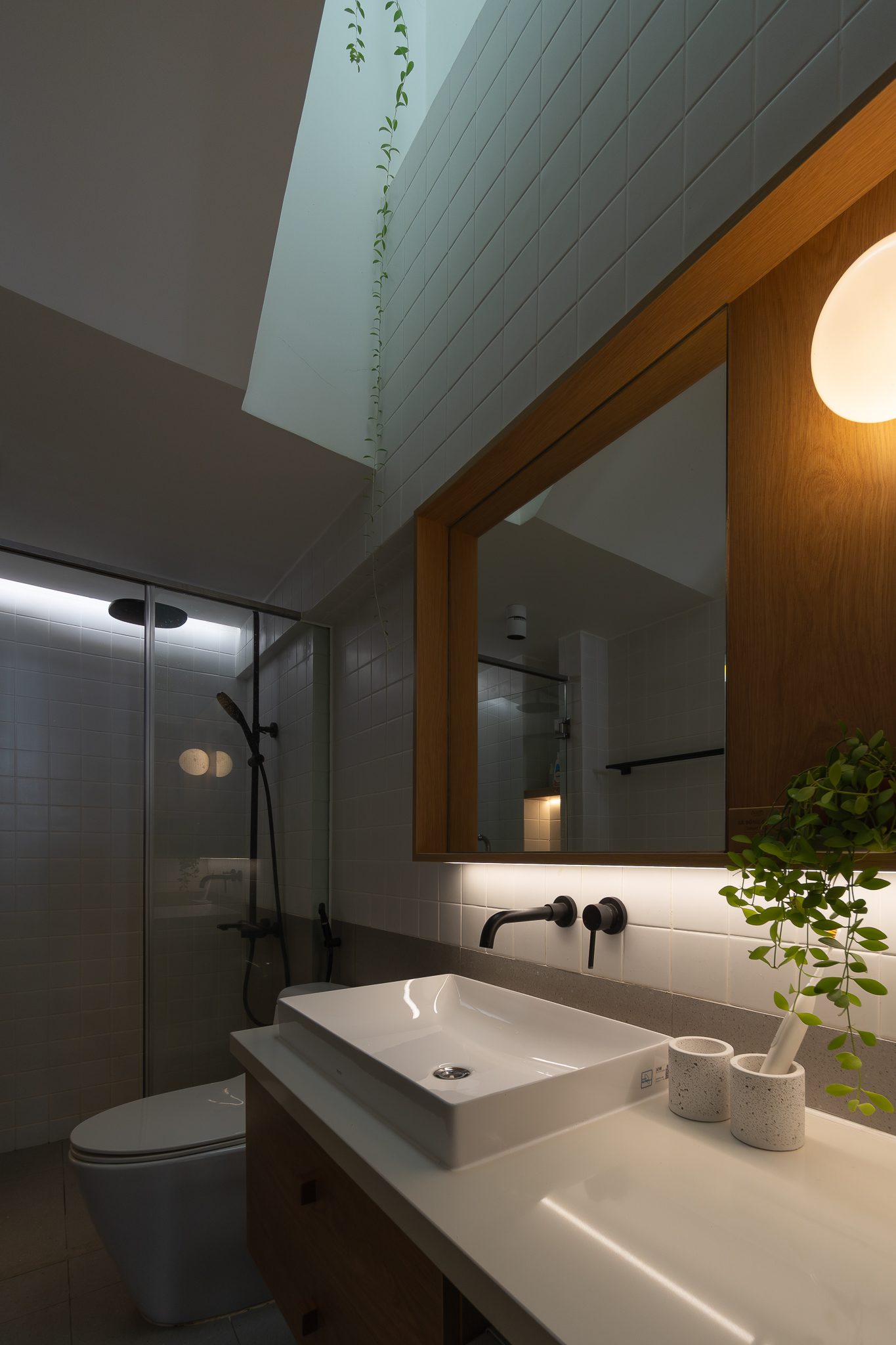 Trên sân thượng, ánh sáng đổ xuống khu tắm bán lộ thiên, kết hợp khu vườn nhỏ – nơi gia chủ trồng và chăm những chậu cây yêu thích. Từ trên cao, ngôi nhà mở ra một cảm giác khác: vừa riêng tư, vừa gần gũi. Sau hai năm kể từ ngày hoàn thiện, A.K Home vẫn giữ nguyên nhịp sống yên ả ấy – một ngôi nhà không phô trương, nhưng phản chiếu rõ ràng cách con người tìm thấy sự bình yên trong những điều giản dị nhất.