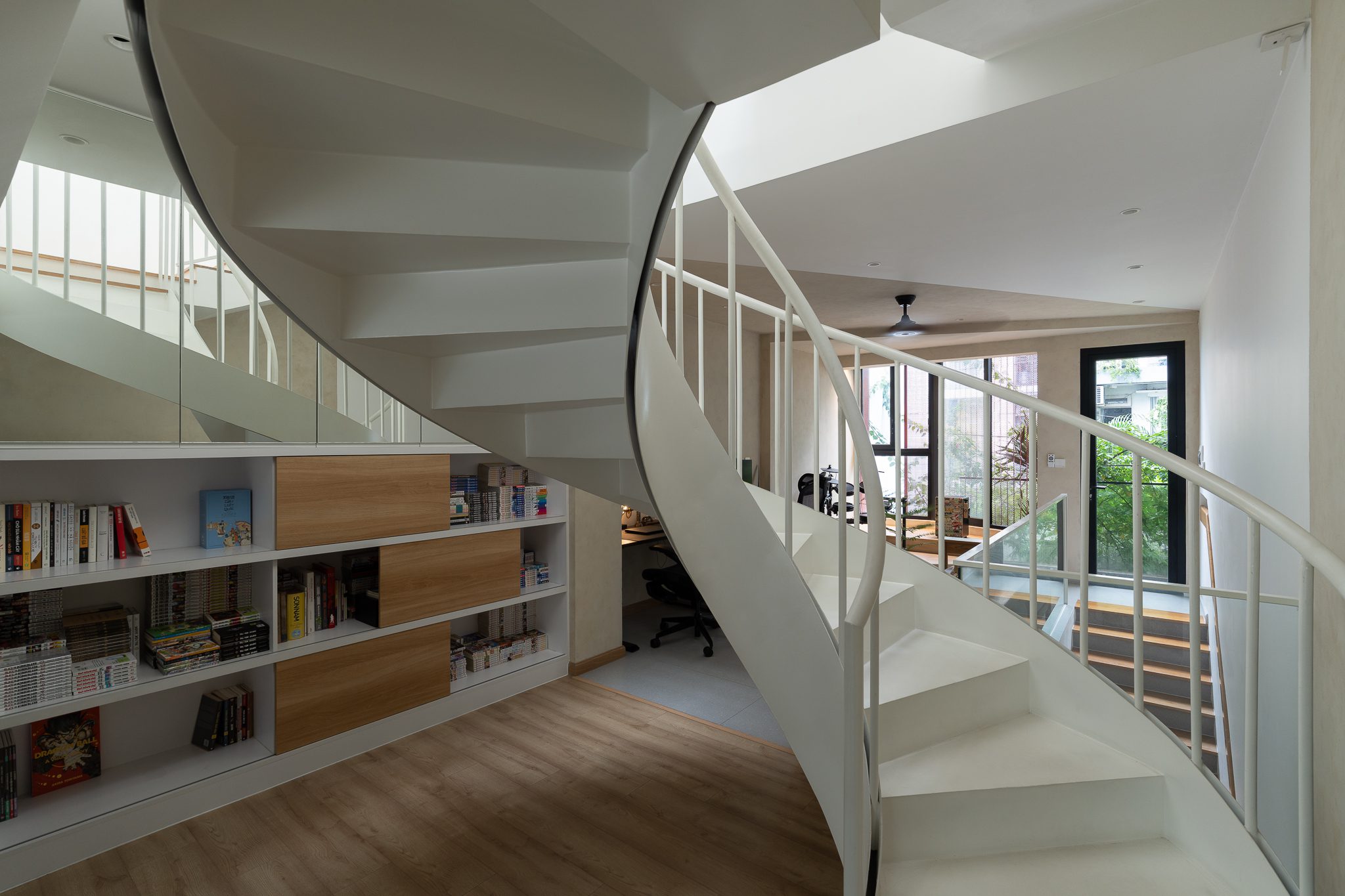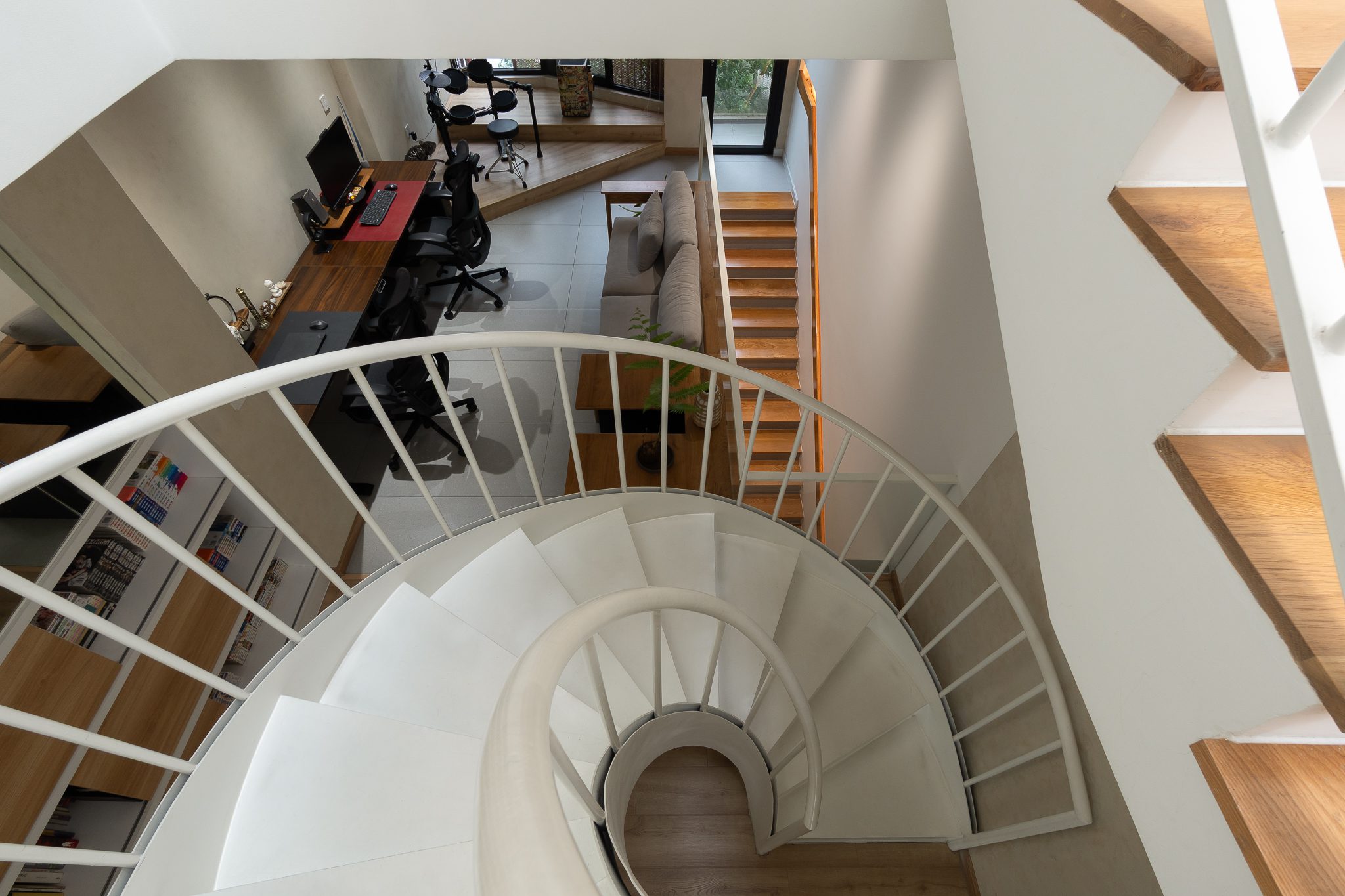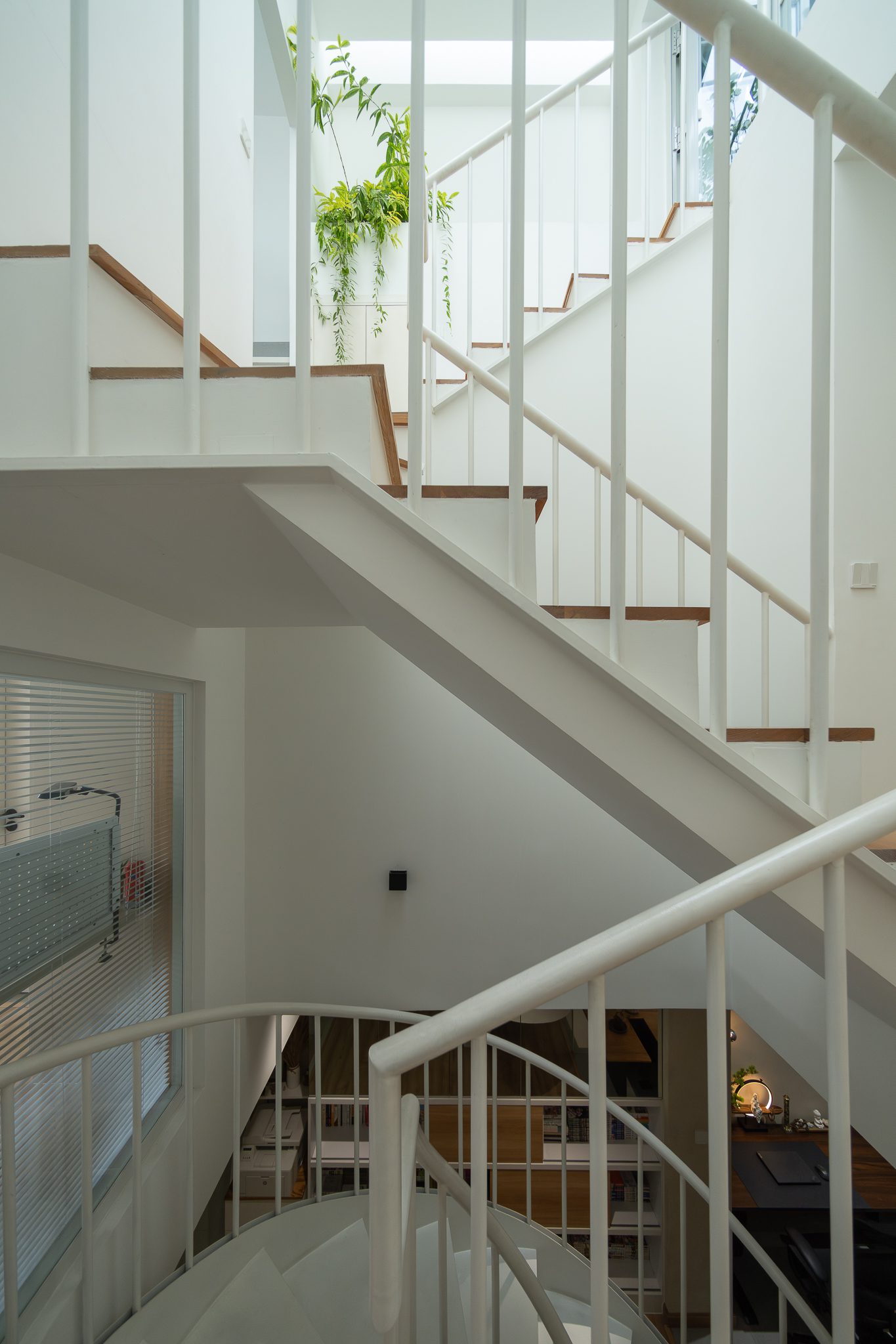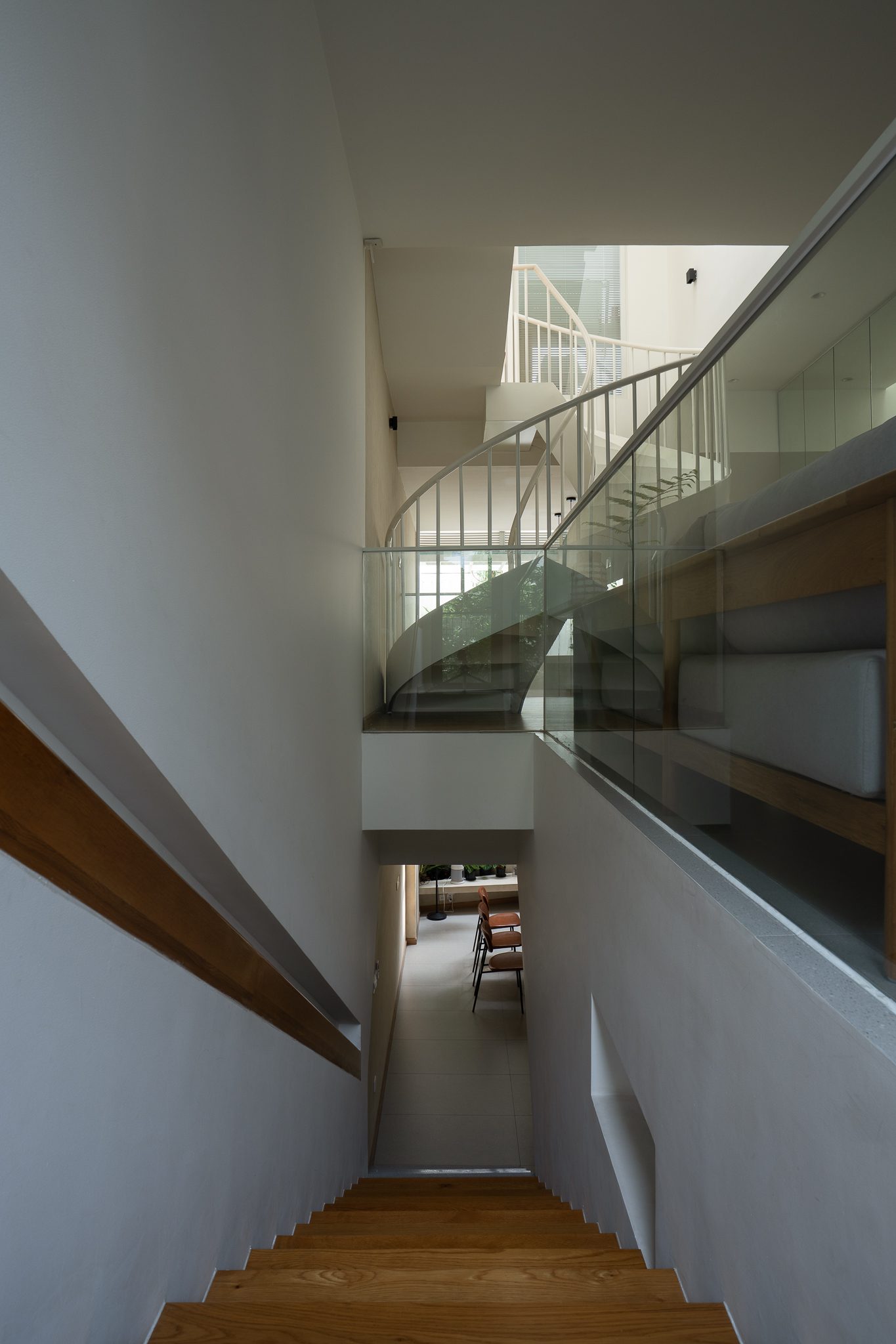 Công trình được tổ chức theo mô hình lệch tầng, giúp không gian di chuyển trở nên linh hoạt và đầy bất ngờ. Từ khoảng sân nhỏ phía trước, ánh sáng và gió len vào qua lớp lưới thép mảnh, dẫn lối đến khu bếp – trái tim của ngôi nhà. Mỗi tầng là một lớp trải nghiệm khác nhau: cầu thang cong kết nối nhẹ nhàng giữa các tầng sinh hoạt, phòng ngủ đón nắng sớm qua mảng tường gấp khúc, và những khoảng mở tràn ánh sáng xen kẽ cây xanh giúp không gian luôn tươi mới. Dù diện tích khiêm tốn, mọi góc nhỏ trong ngôi nhà đều có thể trở thành nơi nghỉ ngơi – quan sát – hoặc chỉ đơn giản là ngồi yên để tận hưởng sự tĩnh lặng.