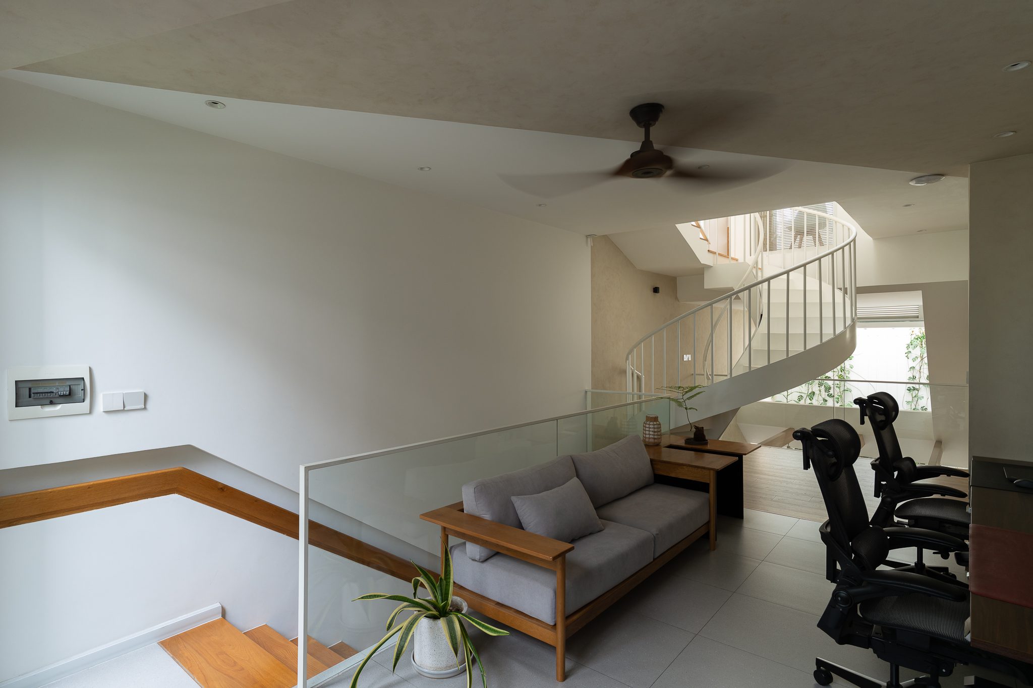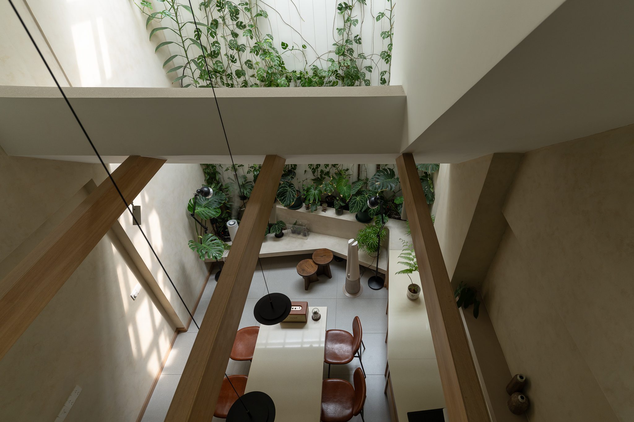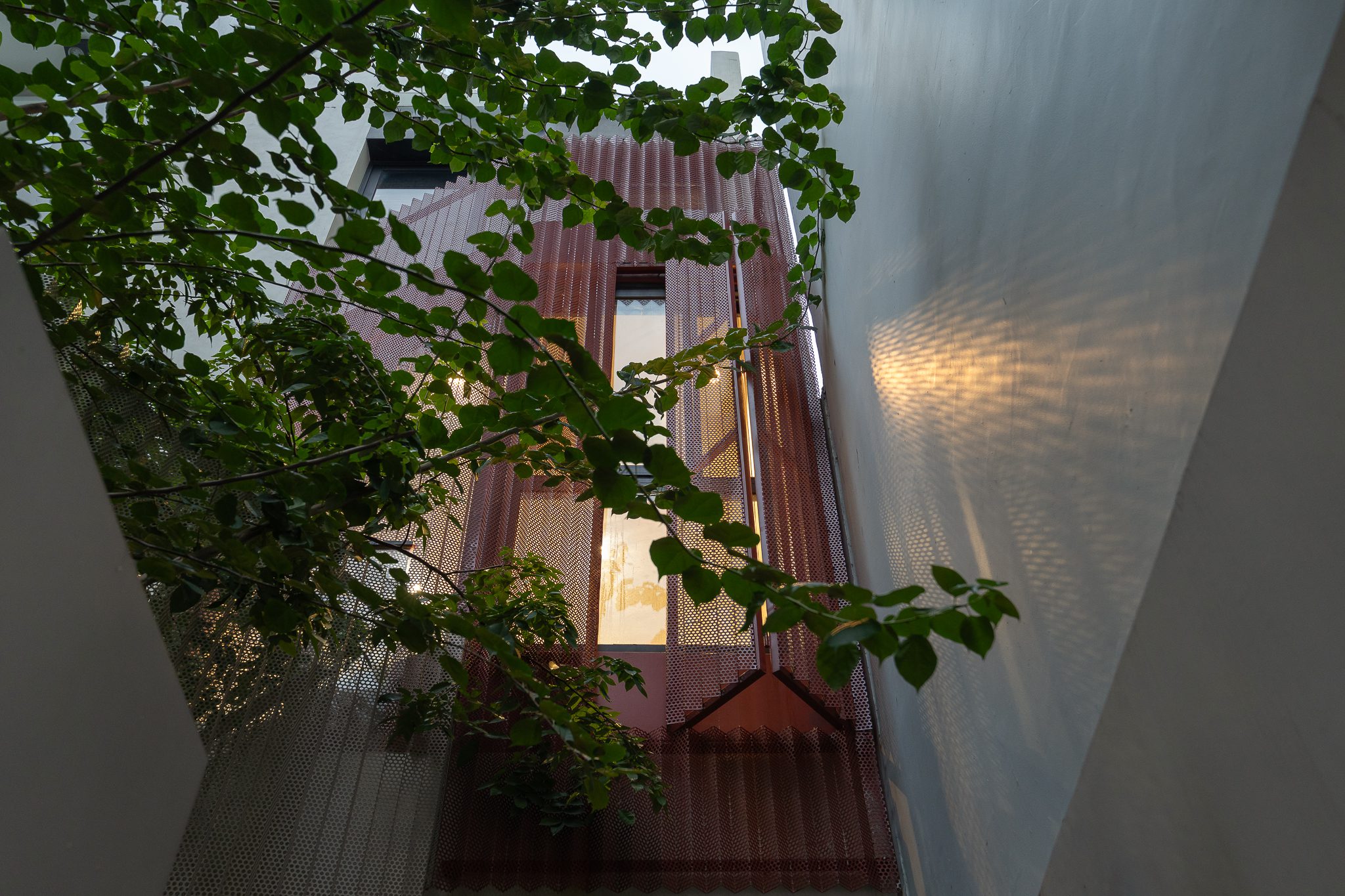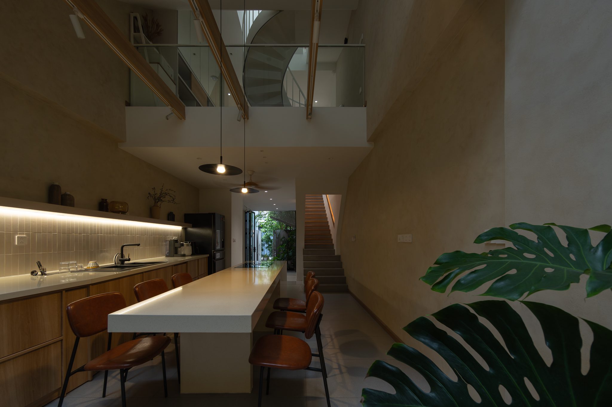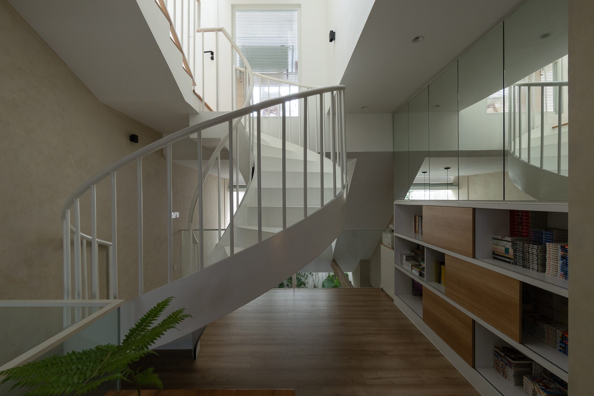 Công trình được tổ chức theo mô hình lệch tầng, giúp không gian di chuyển trở nên linh hoạt và đầy bất ngờ. Từ khoảng sân nhỏ phía trước, ánh sáng và gió len vào qua lớp lưới thép mảnh, dẫn lối đến khu bếp – trái tim của ngôi nhà. Mỗi tầng là một lớp trải nghiệm khác nhau: cầu thang cong kết nối nhẹ nhàng giữa các tầng sinh hoạt, phòng ngủ đón nắng sớm qua mảng tường gấp khúc, và những khoảng mở tràn ánh sáng xen kẽ cây xanh giúp không gian luôn tươi mới. Dù diện tích khiêm tốn, mọi góc nhỏ trong ngôi nhà đều có thể trở thành nơi nghỉ ngơi – quan sát – hoặc chỉ đơn giản là ngồi yên để tận hưởng sự tĩnh lặng.