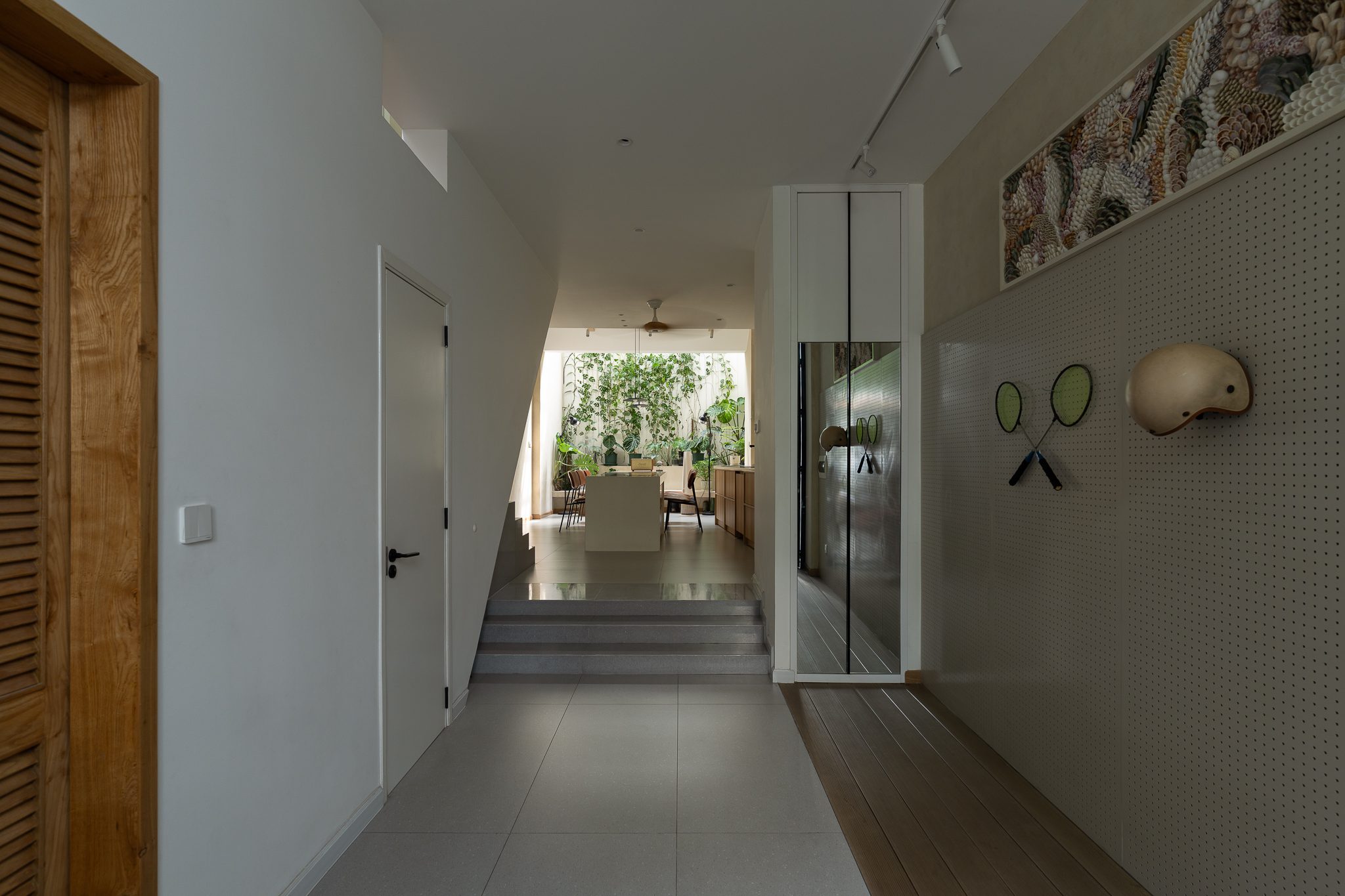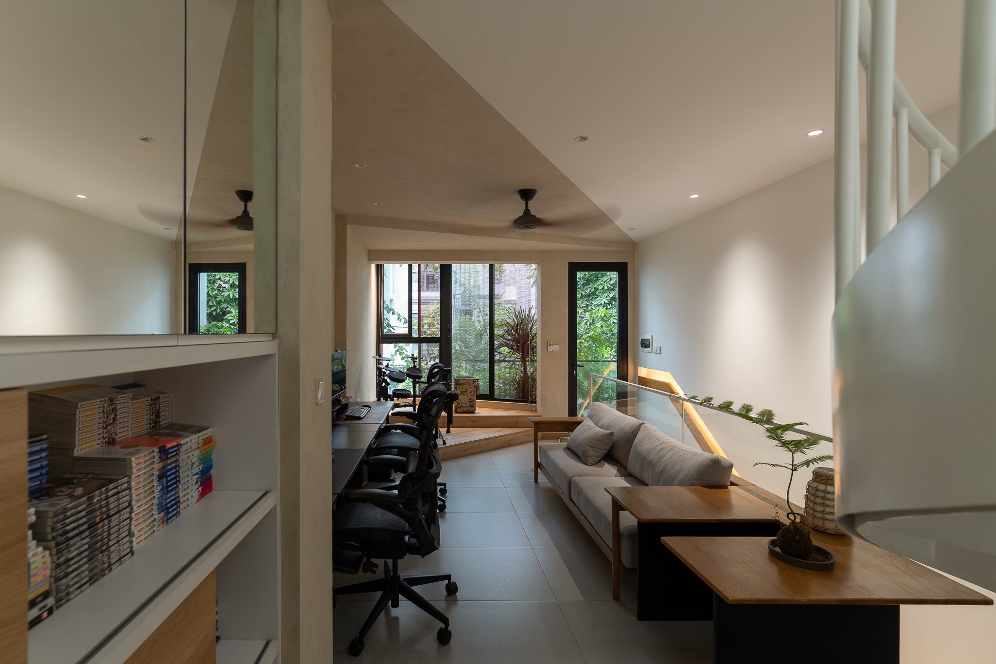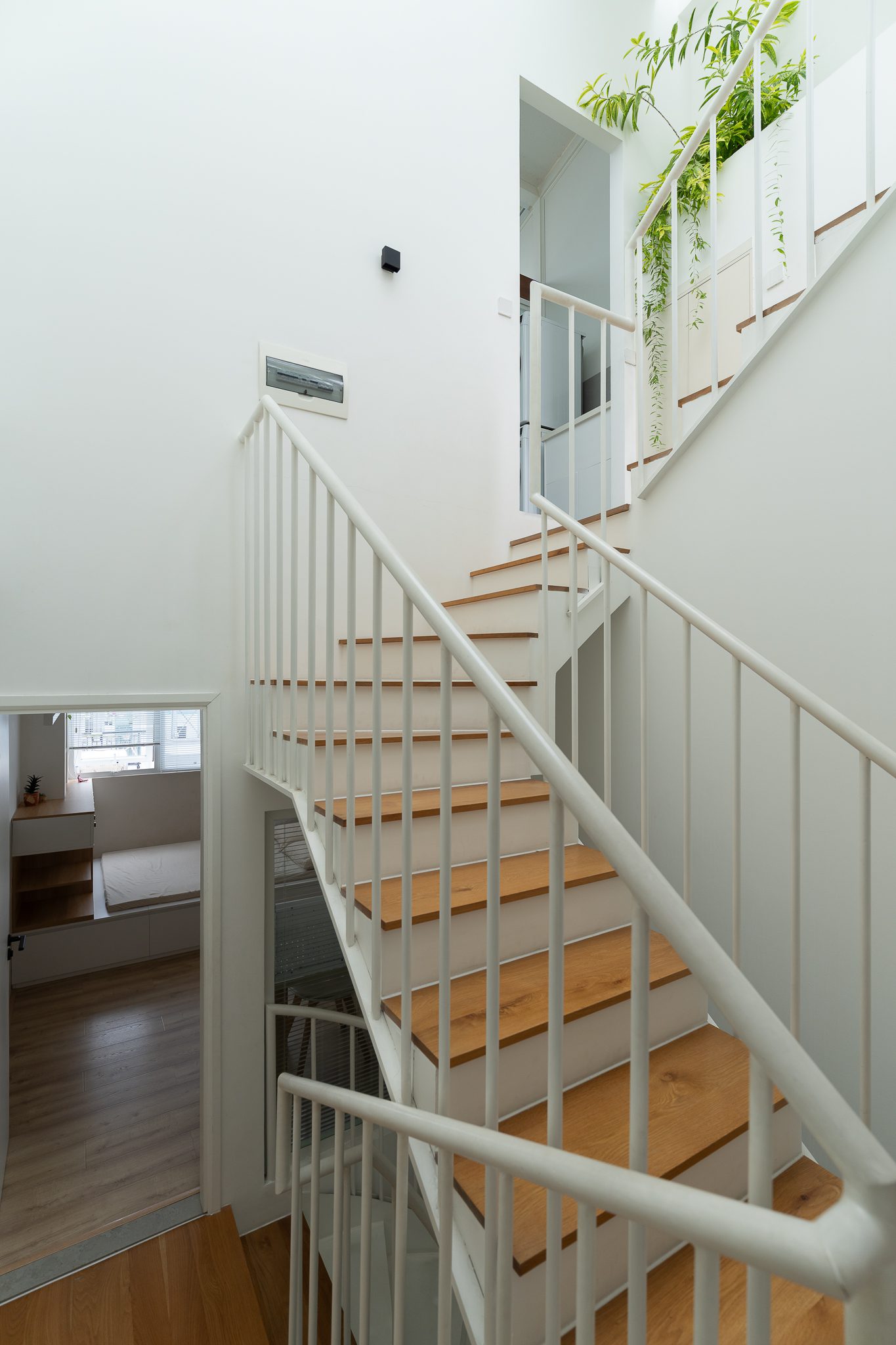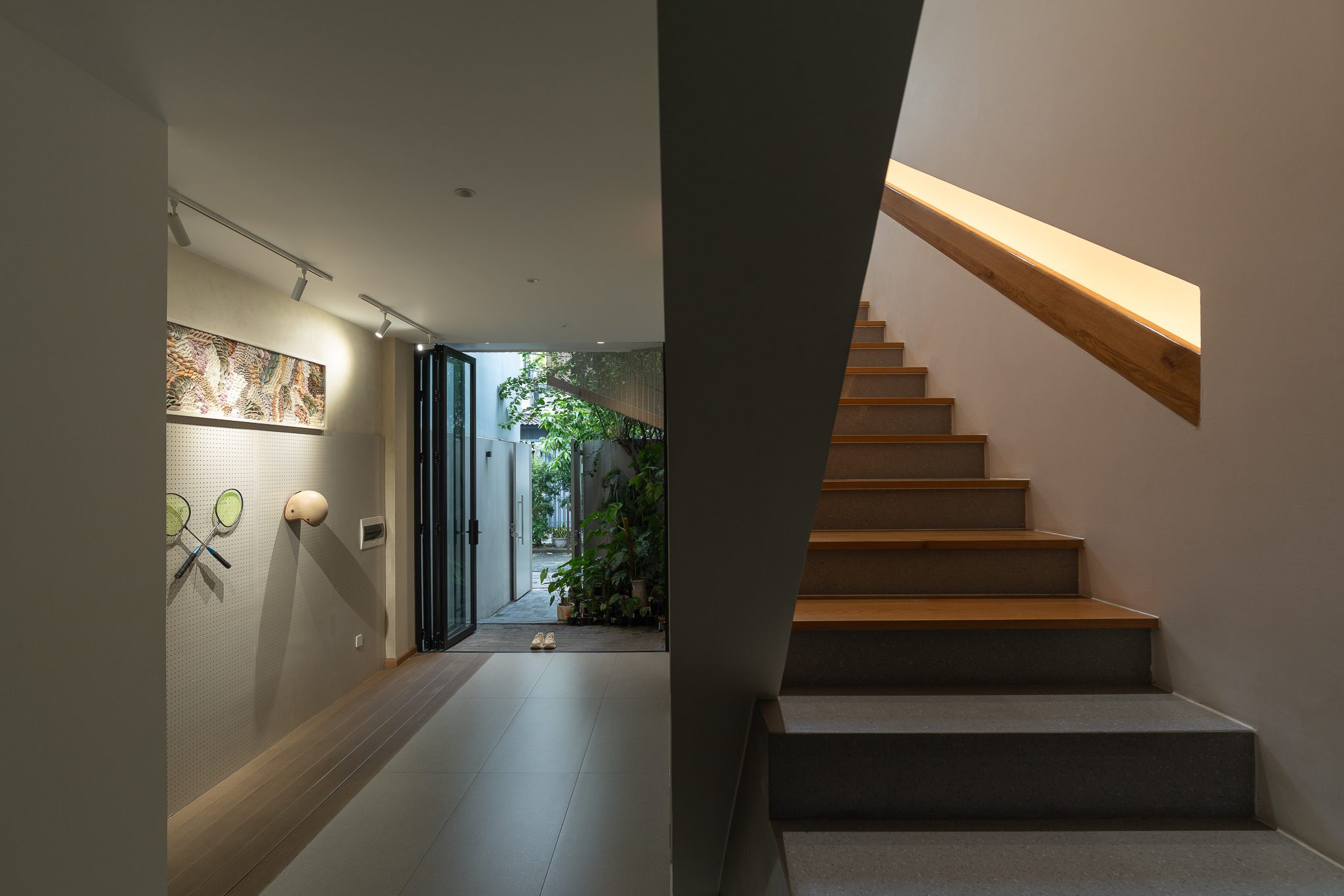 Công trình được tổ chức theo mô hình lệch tầng, giúp không gian di chuyển trở nên linh hoạt và đầy bất ngờ. Từ khoảng sân nhỏ phía trước, ánh sáng và gió len vào qua lớp lưới thép mảnh, dẫn lối đến khu bếp – trái tim của ngôi nhà. Mỗi tầng là một lớp trải nghiệm khác nhau: cầu thang cong kết nối nhẹ nhàng giữa các tầng sinh hoạt, phòng ngủ đón nắng sớm qua mảng tường gấp khúc, và những khoảng mở tràn ánh sáng xen kẽ cây xanh giúp không gian luôn tươi mới. Dù diện tích khiêm tốn, mọi góc nhỏ trong ngôi nhà đều có thể trở thành nơi nghỉ ngơi – quan sát – hoặc chỉ đơn giản là ngồi yên để tận hưởng sự tĩnh lặng.