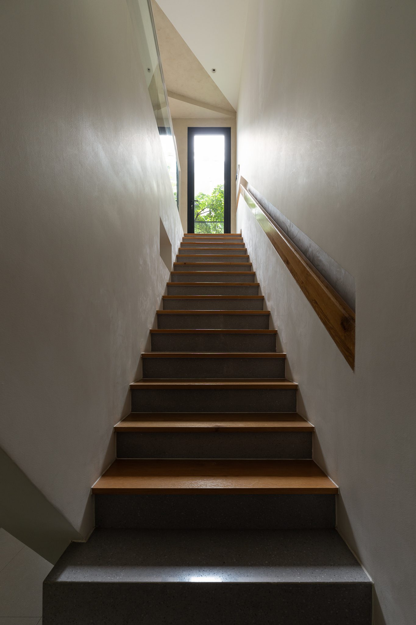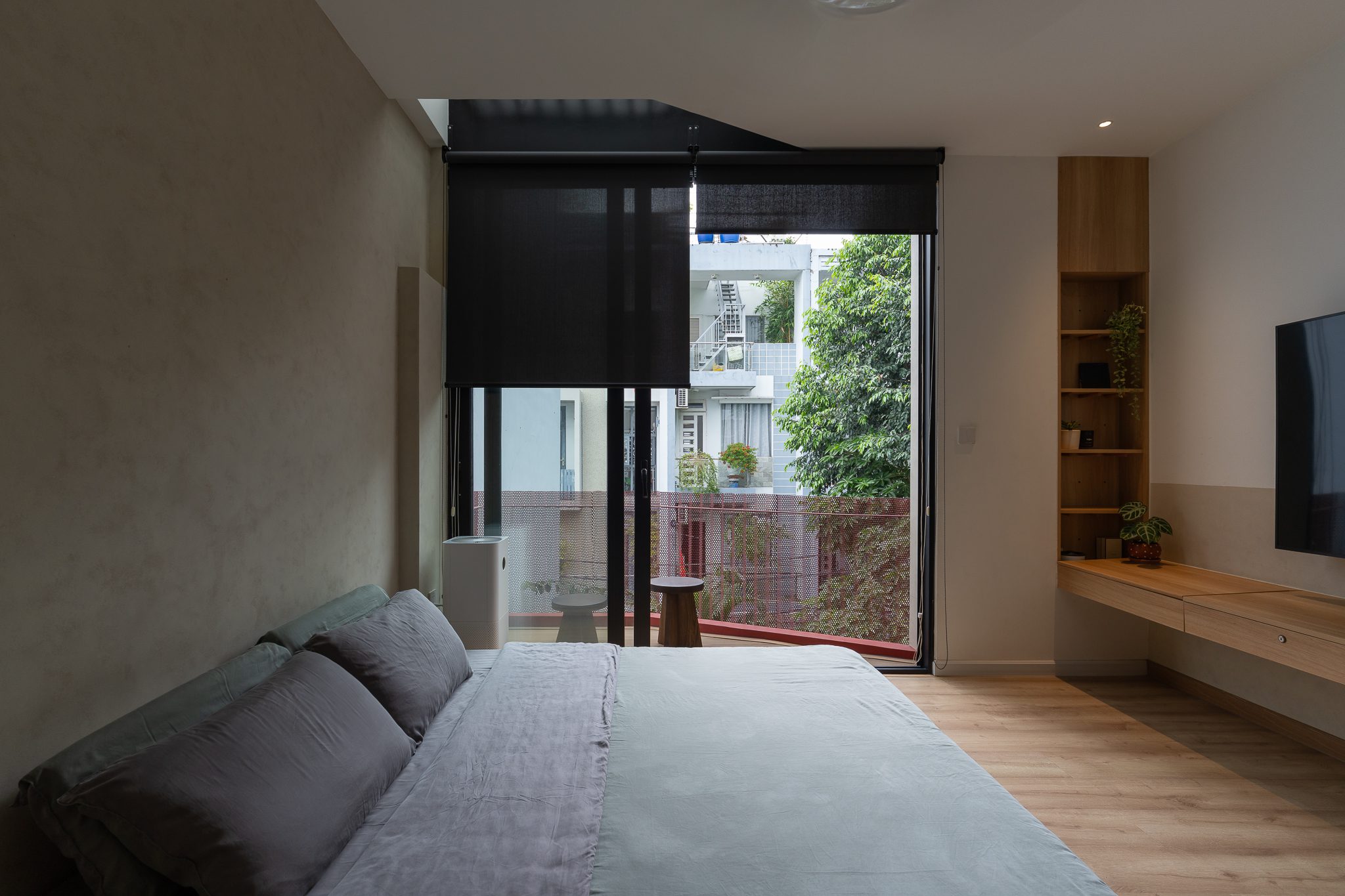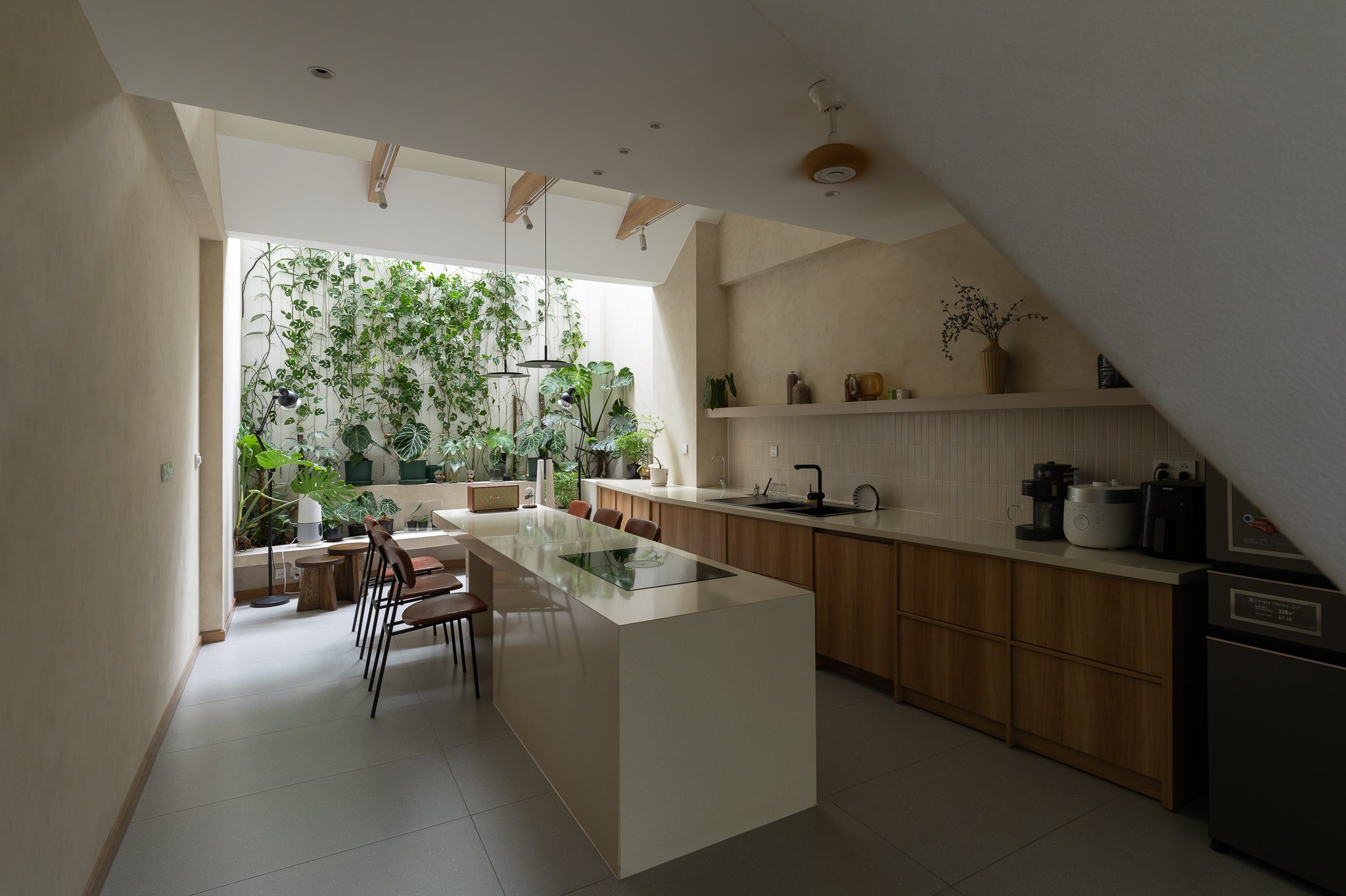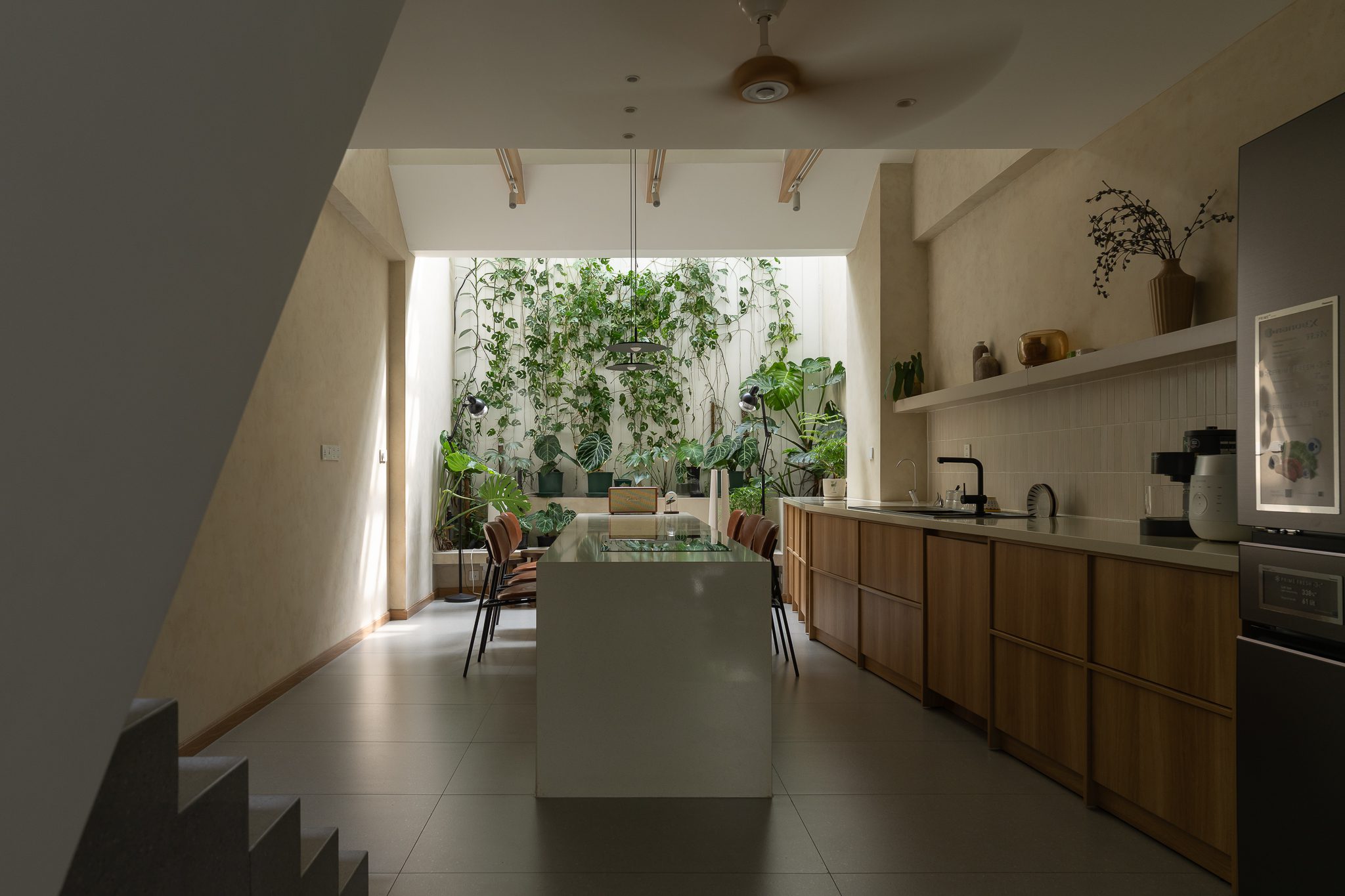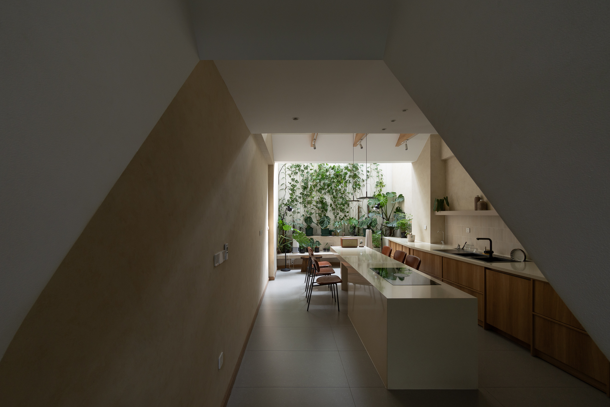 Công trình được tổ chức theo mô hình lệch tầng, giúp không gian di chuyển trở nên linh hoạt và đầy bất ngờ. Từ khoảng sân nhỏ phía trước, ánh sáng và gió len vào qua lớp lưới thép mảnh, dẫn lối đến khu bếp – trái tim của ngôi nhà. Mỗi tầng là một lớp trải nghiệm khác nhau: cầu thang cong kết nối nhẹ nhàng giữa các tầng sinh hoạt, phòng ngủ đón nắng sớm qua mảng tường gấp khúc, và những khoảng mở tràn ánh sáng xen kẽ cây xanh giúp không gian luôn tươi mới. Dù diện tích khiêm tốn, mọi góc nhỏ trong ngôi nhà đều có thể trở thành nơi nghỉ ngơi – quan sát – hoặc chỉ đơn giản là ngồi yên để tận hưởng sự tĩnh lặng.