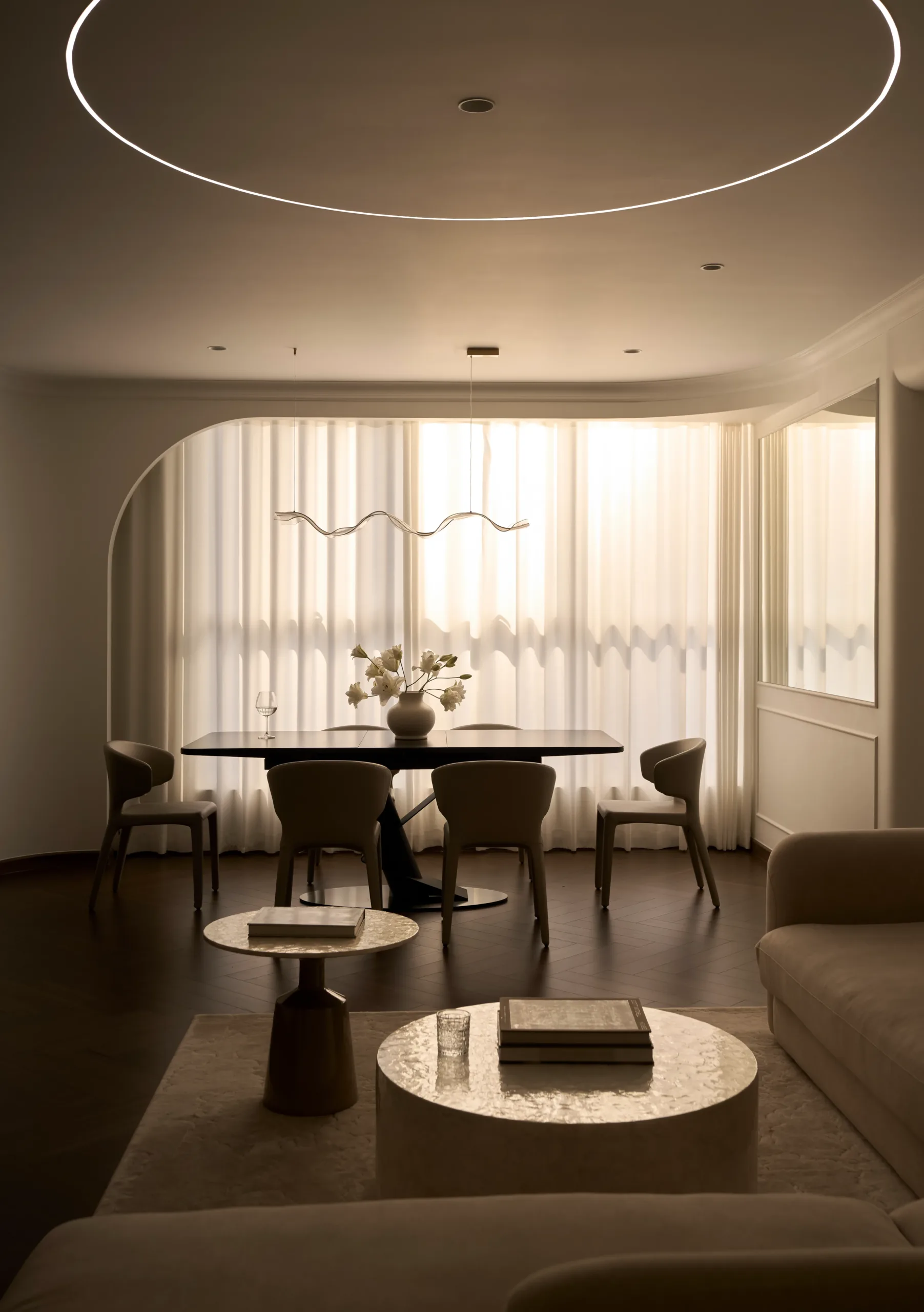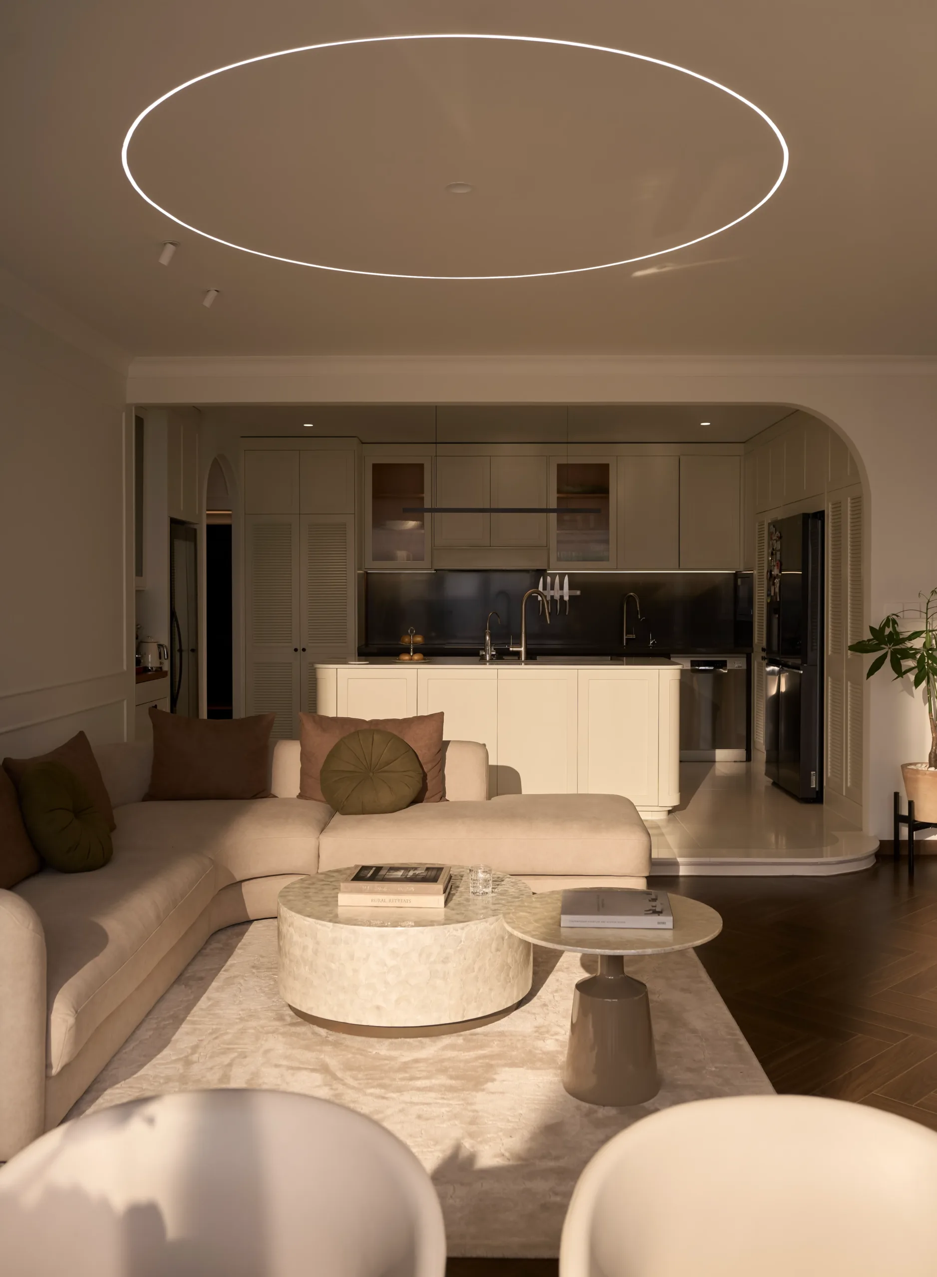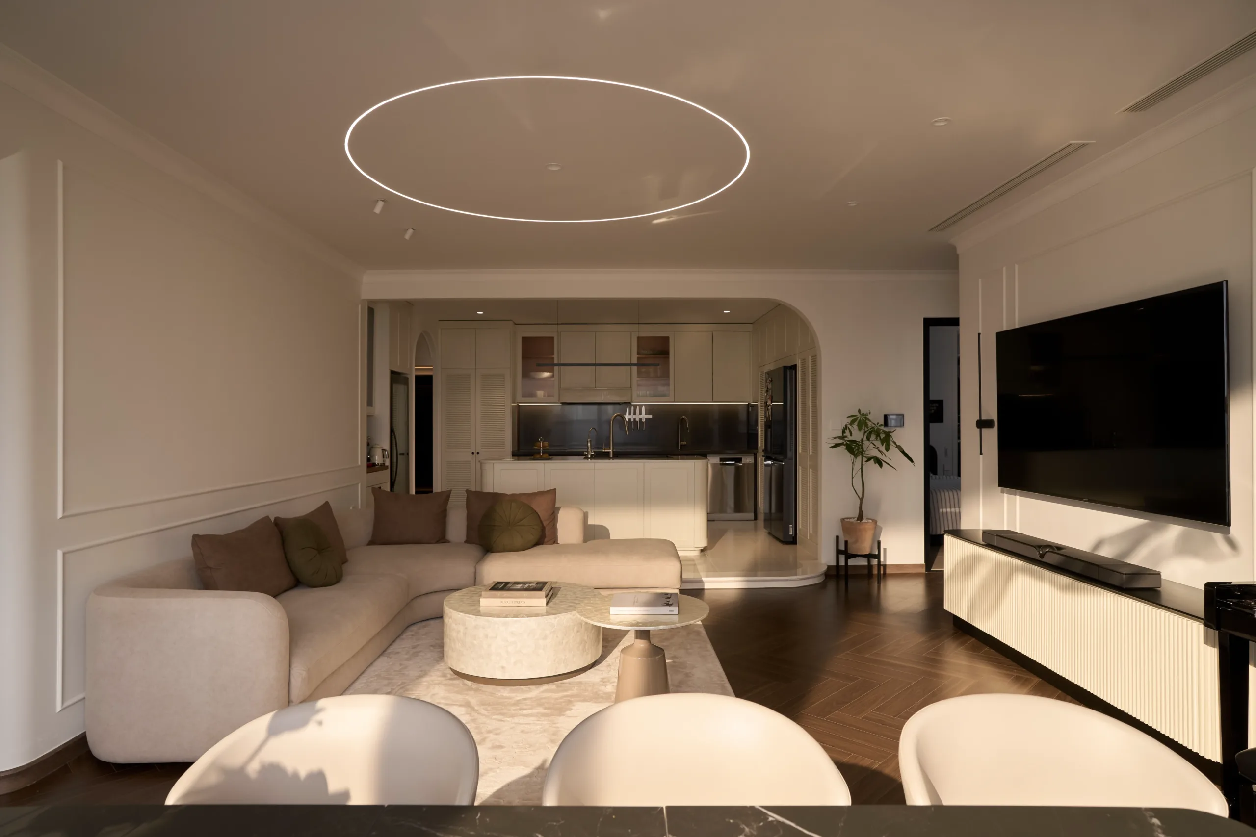 Tại The Inner Flow, phòng khách và bếp được đặt trên cùng một trục nhìn hướng về view Landmark 81, trở thành lõi thị giác của toàn bộ căn hộ. Khu bếp được nâng cao độ nhẹ, tạo chênh lệch cao trình vừa đủ để mở rộng góc nhìn và tăng chiều sâu không gian sinh hoạt chung.