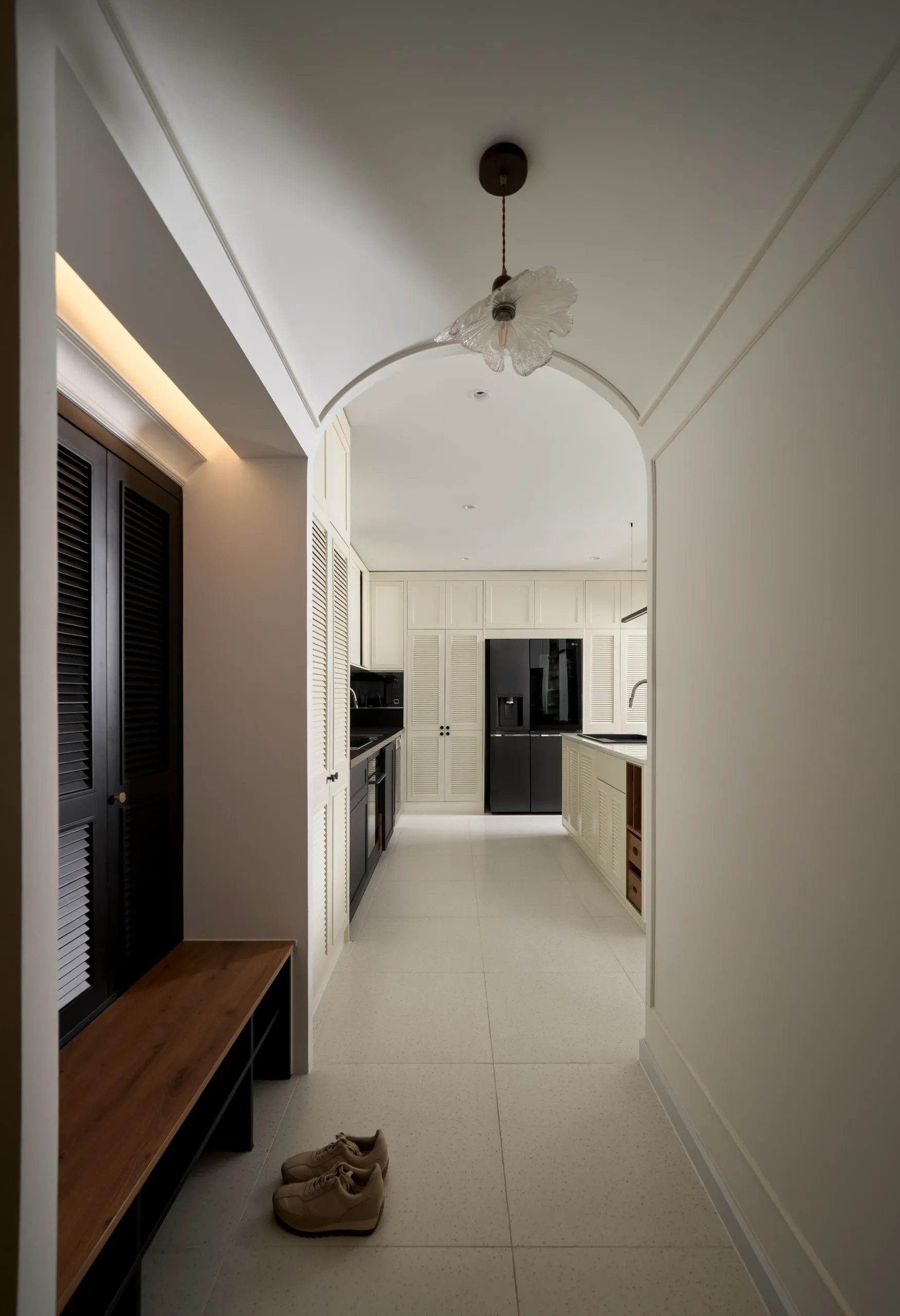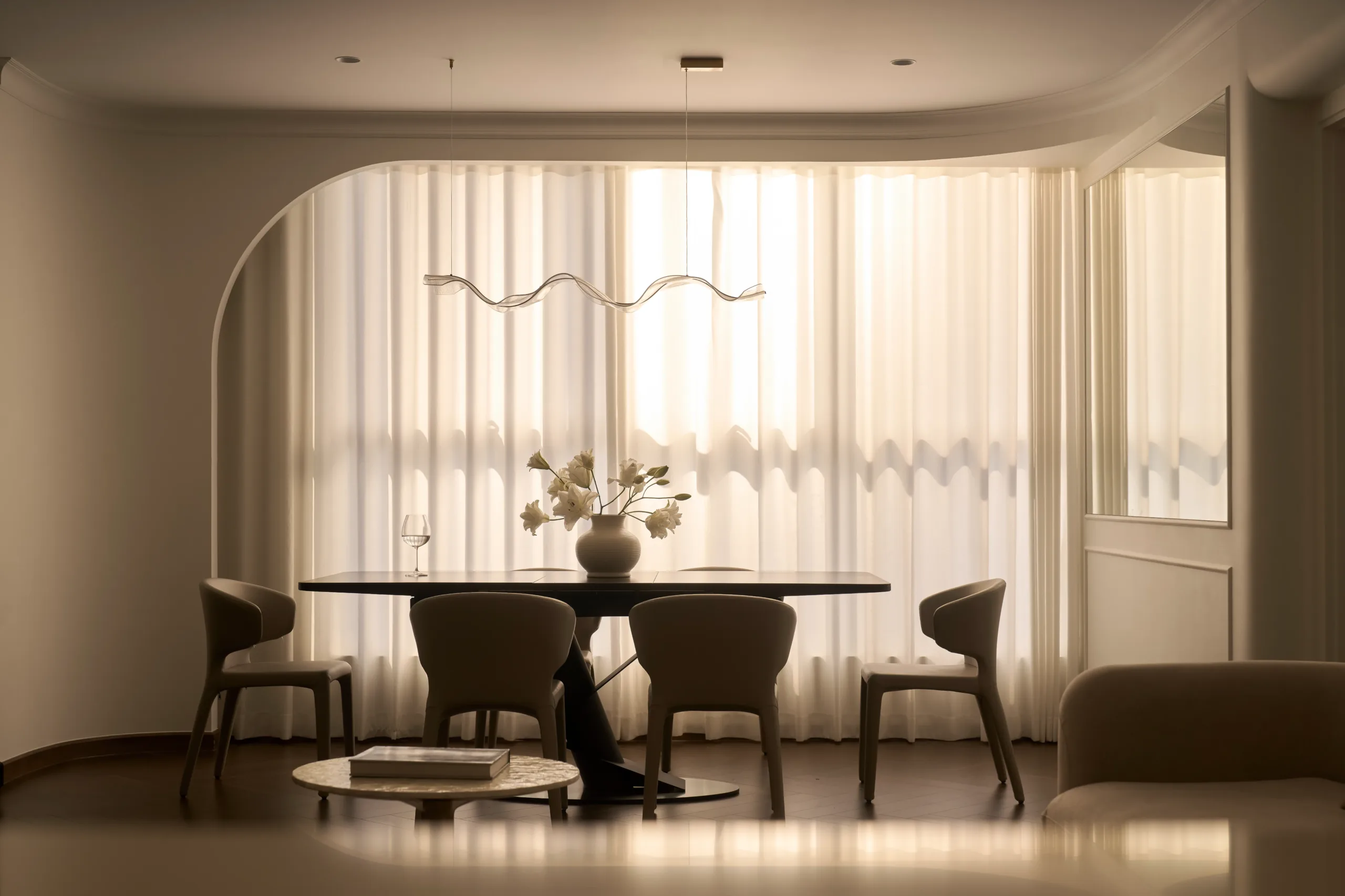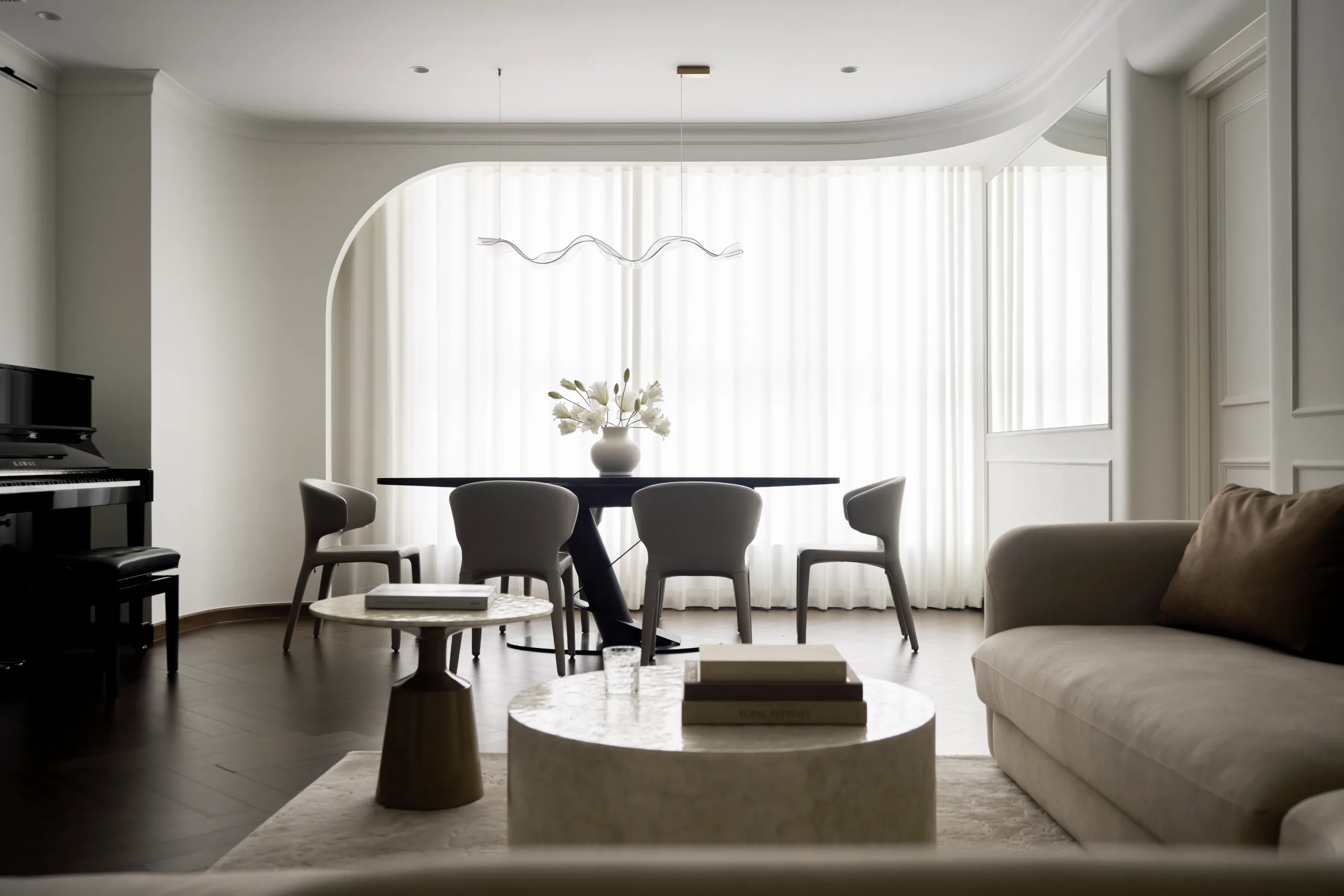 Tại The Inner Flow, phòng khách và bếp được đặt trên cùng một trục nhìn hướng về view Landmark 81, trở thành lõi thị giác của toàn bộ căn hộ. Khu bếp được nâng cao độ nhẹ, tạo chênh lệch cao trình vừa đủ để mở rộng góc nhìn và tăng chiều sâu không gian sinh hoạt chung.